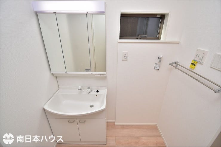 【洗面台、洗濯機置場】洗面台は3面鏡で収納が多く水回りの小物もスッキリ片付きます♪ 15/42