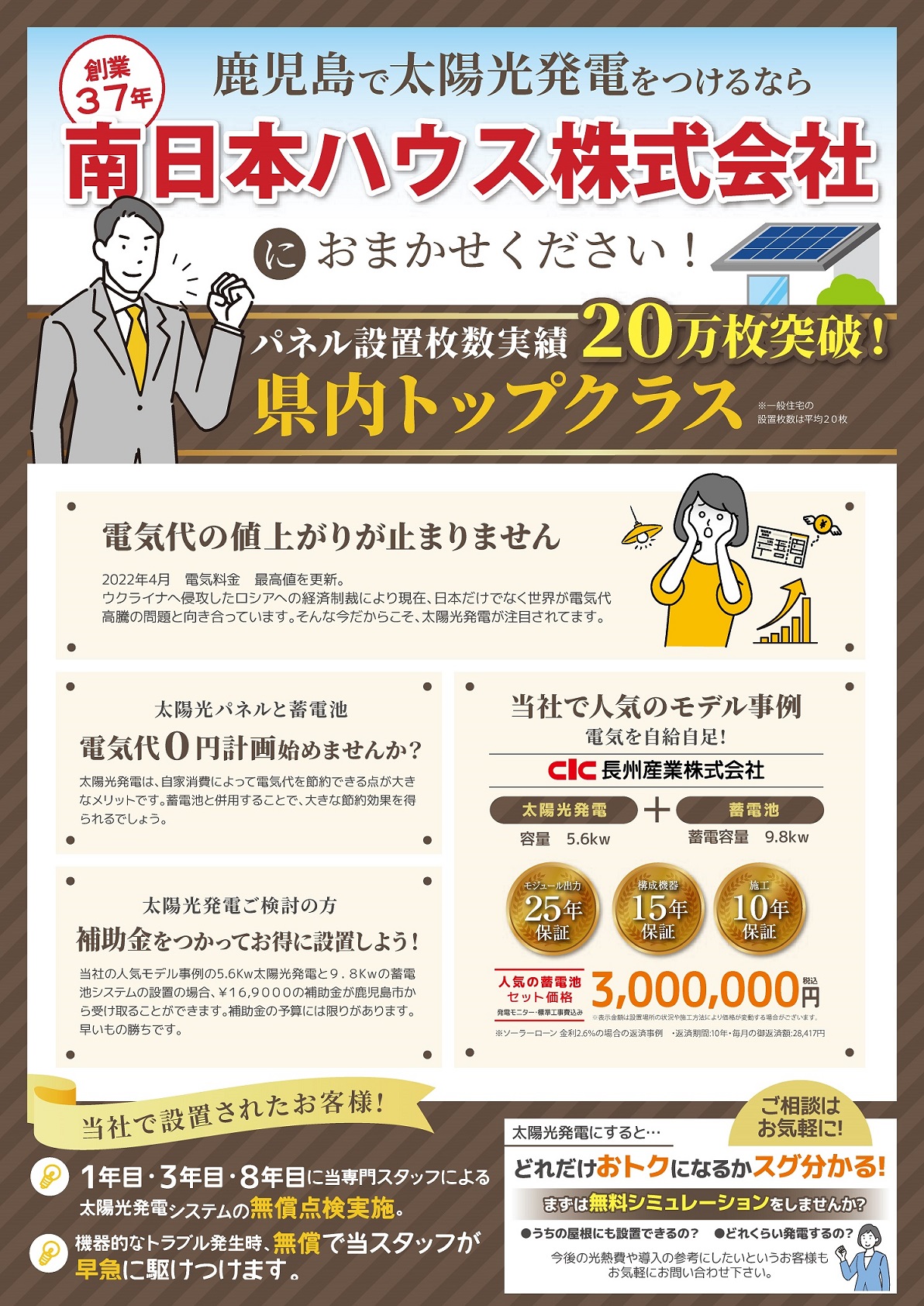 鹿児島で太陽光発電をつけるなら、創業37年、鹿児島市内で3店舗展開中の南日本ハウスにおまかせください