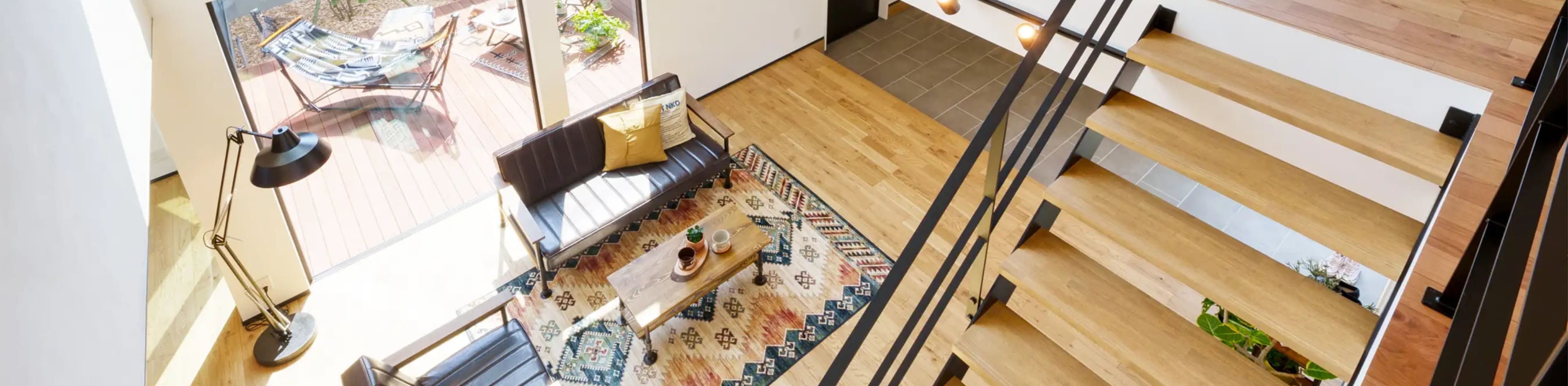 LIVINGリビングからダイニングキッチンまで広がり、高さのある吹抜けによってメリハリを演出。床材に用いたオークの木目とスチールとの異素材コラボが空間をカッコよく、印象的に彩ります。 -